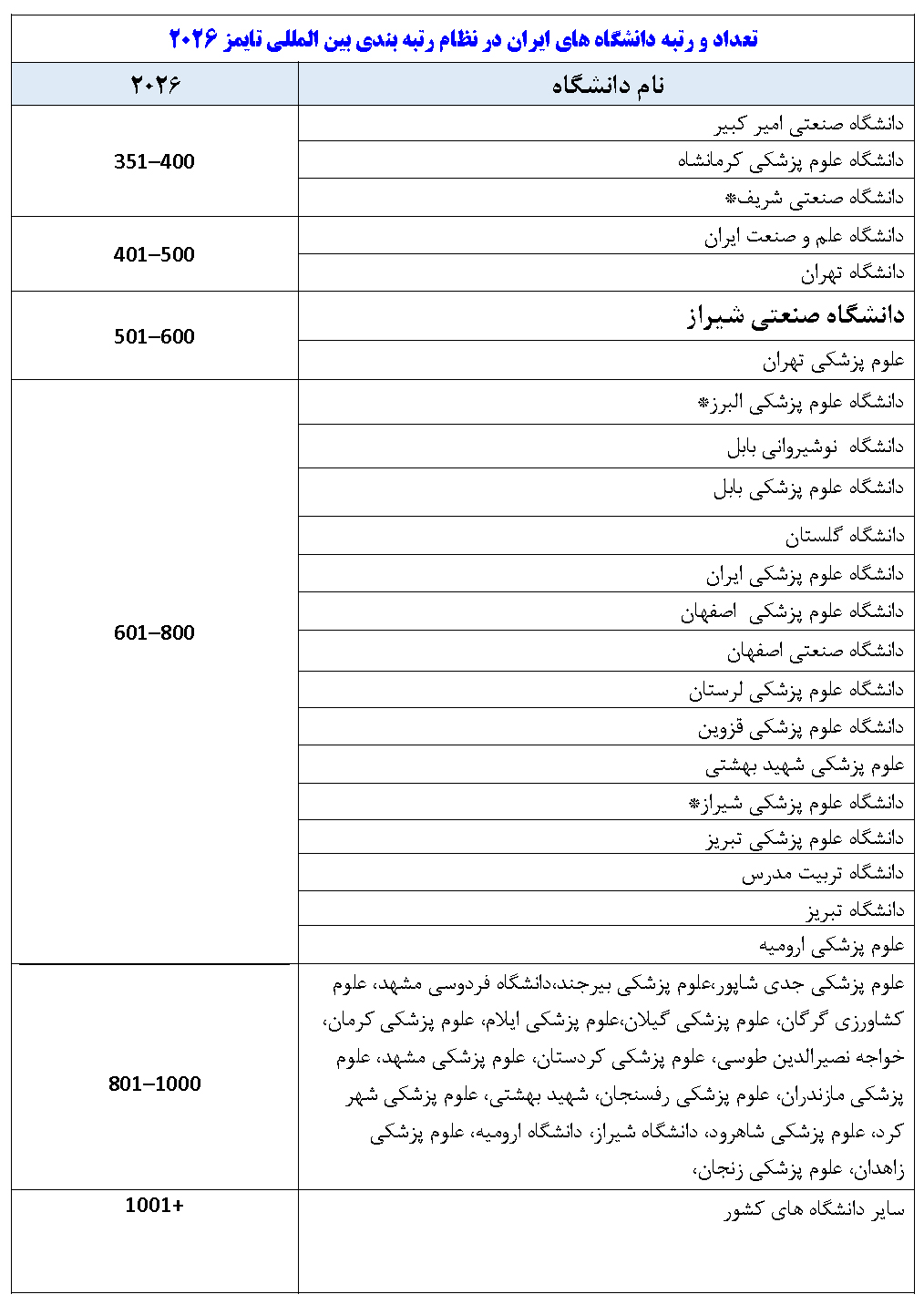 پایگاه رتبه‌بندی تایمز در سال 2026  فهرستی از 2191 دانشگاه و موسسه پژوهشی از 115 کشور در سراسر دنیا را درآخرین رتبه بندی خود منتشر نموده است. در این لیست تعداد 90 دانشگاه از ایران مشاهد میشود که دانشگاه صنعتی شیراز با کسب رتبه در بازه 600-501 در سومین بازه رتبه بندی انجام شده در کشور قرار دارد. بر اساس این لیست دانشگاه های امیرکبیر، صنعتی شریف و علوم پزشکی کرمانشاه در بازه 400-351 ، دانشگاه علم و صنعت ایران و دانشگاه تهران در بازه 500-401 ، دانشگاه صنعتی شیراز و علوم پزشکی تهران در بازه 600-501 قرار داشته و سایر دانشگاه های کشور شامل 83 دانشگاه در بازه 601 به بالا قرار دارند. همانطور که از جدول ملاحظه میشود تنها 7 دانشگاه کشور در رتبه بندی سال 2026، رتبه زیر 600 قرار گرفته است. در رتبه بندی سال 2025 از ایران تعداد 81 دانشگاه حضور داشت که دانشگاه صنعتی شریف در رتبه 350-301 ، دانشگاه های امیر کبیر و علم وصنعت ایران در رتبه 400-351، دانشگاه علوم پزشکی کرمانشاه و دانشگاه تهران در رتبه 500-451 قرار داشتند. همچنین دانشگاه صنعتی نوشیروانی بابل، دانشگاه صنعتی شیراز و دانشگاه علوم پزشکی تهران در رتبه 600-501 قرار داشتند و در مجموع 8 دانشگاه ایران دارای رتبه زیر 600 بودند. دانشگاه صنعتی شیراز با حفظ رتبه بندی گذشته کماکان در بازه سوم در میان دانشگاه های کشور و رتبه ششم کشوری قرار گرفته است.