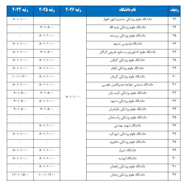 لازم به ذکر است که در جدول دانشگاه هایی که رتبه بندی آنها در بازه یکسان هستند همگی هم رتبه بوده و ترتیب اسامی ذکر شده در این گزارش مطابق با سامانه رتبه بندی تایمز و بر اساس حروف الفبا (به لاتین) است.