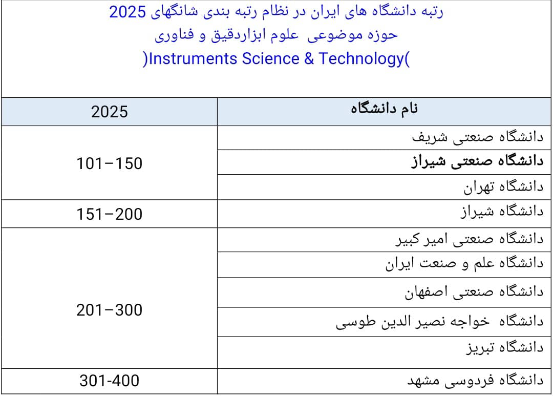 پیشتازی دانشگاه صنعتی شیراز در رتبه‌بندی شانگهای ۲۰۲۵ در حوزه موضوعی علوم ابزاردقیق و فناوری
